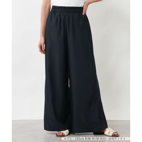 キュプラとポリエステルの混紡生地を使用し、滑らかな肌触りと上品な落ち感を実現したワイドイージーパンツ。ボリュームのあるワイドシルエットが、旬の着こなしに程よいリラックス感と優雅なニュアンスを添えてくれます。裾にはベンツを施すことで足元に軽やかな動きと抜け感をプラス。ウエストは総ゴム仕様になっており、ストレスフリーな穿き心地を叶えつつ、やや薄手のさらりとした素材感で汗ばむ季節も快適に過ごせます。