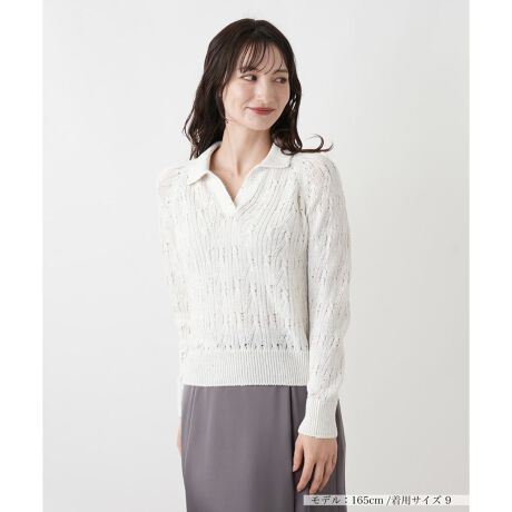 透かし編みにラメ糸とスパンコールを贅沢に編み込んだ、涼しく華やかなニットポロ。さりげなく煌めき、初夏のスタイリングに品格のある輝きを添えてくれます。首元はボタンのないスキッパーネック仕様で、デコルテをすっきりと見せつつ、抜け感のある大人らしい表情を演出。襟付きのデザインが程よいきちんと感を醸し出し、カジュアルなボトムスと合わせても洗練された印象に仕上がります。デイリーからちょっとしたお出かけまで幅広く活躍するトップスです。
