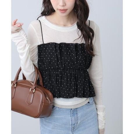 毎年人気のアイテムが新色・新柄でアップグレード!ウエストのギャザーを上端でランダムにおさえて、立体的なタック風デザインに仕上げたキャミソールビスチェ。2枚仕立て×裏地はジャージー付きで透けにくく、着脱しやすい仕様に。ウエストはゴム仕様、肩ヒモは長さ調節できます。軽量ナイロン素材でナチュラルな風合いも特徴。クチュール感のあるビスチェを、あえてデニムやカーゴパンツでカジュアルダウンして着るのがおすすめです。※モデルの着用画像の場合、光の当たり具合により、実際の色味と異なって見えることがございます。色味は、商品単体の画像をご参照ください。