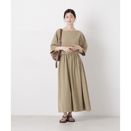 スッキリしたボートネックのデザインが女性らしい雰囲気のワンピース。華やかさがありつつも、キレイ目にもカジュアルにも着回しやすく、デイリーの着回しに頼れるアイテムです。
