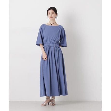 スッキリしたボートネックのデザインが女性らしい雰囲気のワンピース。華やかさがありつつも、キレイ目にもカジュアルにも着回しやすく、デイリーの着回しに頼れるアイテムです。