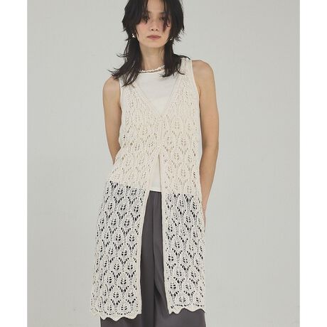 ドライタッチな糸で編み立てた、軽やかな透かしニットジレ。