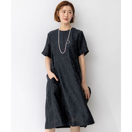艶感とほのかにシアーな透け感のある素材で、さりげなく花柄を織りで表現した半袖ブラックドレス。すっきりとしたクルーネックのシンプルなデザインながら、裾にかけて品よくAラインに広がるように分量感やシルエットにこだわったデザイン。ややゆとりを持たせた袖感で着合わせに迷うことなく、1枚で品よく着映えが叶います。背面中央にグログランリボンの引手をつけたファスナーを採用することさりげなくアクセントを加えています。