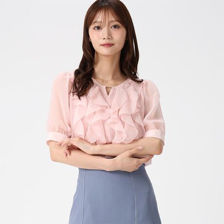 ラッフルデザインが、華やかな印象を与えるブラウス。