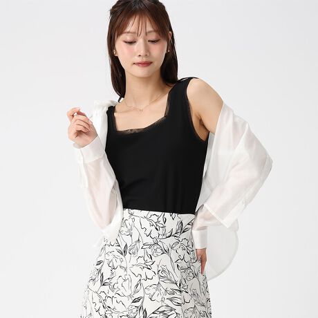 シアー素材でトリミングされたデザインが魅力の、洗練された印象のタンクトップ。