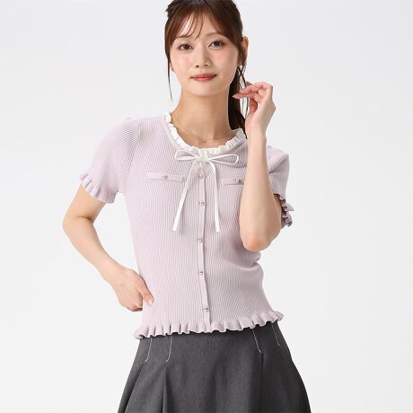 ひらひらとしたフリルが、ガーリーなムードを引き立てるレイヤード風ニット。