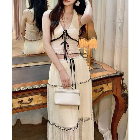 透け感のあるロングスカート付きで、ビーチやリゾートシーンまで幅広く使える三点セット。