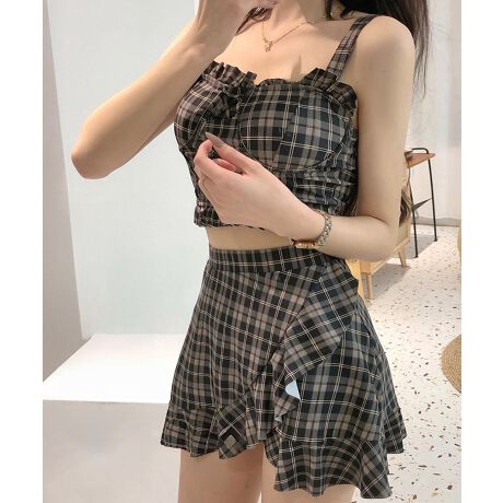 レトロなチェック柄と贅沢なフリル使いが可愛い、ビスチェタイプのセパレート水着。
