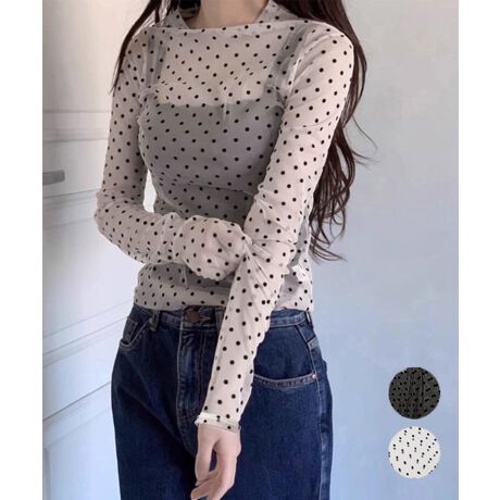 ドット柄のシアー素材が目を惹く、今季トレンドの長袖シアートップス。