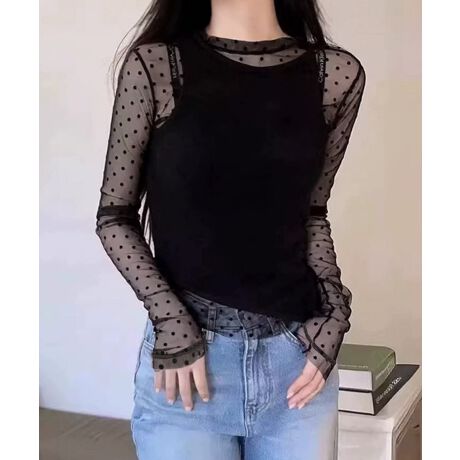 ドット柄のシアー素材が目を惹く、今季トレンドの長袖シアートップス。