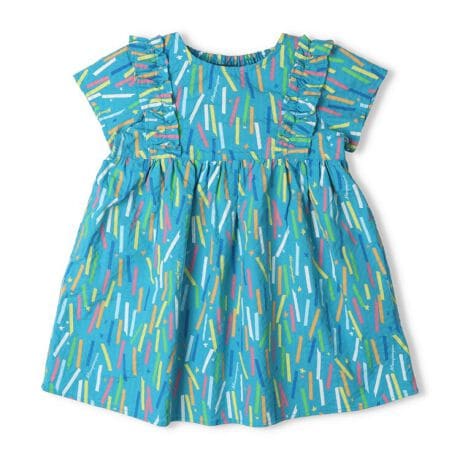 ポコポコと凹凸感のある夏らしいサッカー素材にレインボーカラーのカラフルなテープと星がプリントされた半袖ワンピース。肩のフリルのデザインも女の子らしいポイント!同じ柄のハーフパンツ(M37101)もあるので、兄弟姉妹やお友達と男女でアイテム違いでペア、リンクコーデ、お揃い、おそろいコーディネートも楽しめます!【アイテム】トップス シンプル ガーリー フェミニン カジュアル お洒落 オシャレ かわいい 可愛い 普段着 デイリーウェア お出かけ着 お外着 お外遊び着 子ども こども 女児 女の子 ガールズ キッズ ベビーサイズ トドラーサイズ 幼稚園 保育園 小学校 通園 通学 小学生 2026年春夏物新作 丸高衣料 オフホワイト 白色 ターコイズブルー 青色 ムージョンジョン 兄妹 姉弟 兄弟 姉妹 お揃い オソロ おそろい お揃いリンク リンクコーデ ペアルック