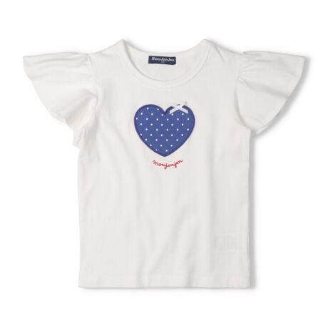 リボンのモチーフが付いた水玉柄、ドット柄のハートのアップリケがポイント!フレアーな袖もガーリーな半袖Tシャツ。【アイテム】トップス シンプル ガーリー フェミニン カジュアル お洒落 オシャレ かわいい 可愛い 普段着 デイリーウェア お出かけ着 お外着 お外遊び着 子ども こども 女児 女の子 ガールズ キッズ ベビーサイズ トドラーサイズ 幼稚園 保育園 小学校 通園 通学 小学生 2026年春夏物新作 丸高衣料 ホワイト 白色 ピンク りぼん コットン100% 綿100%