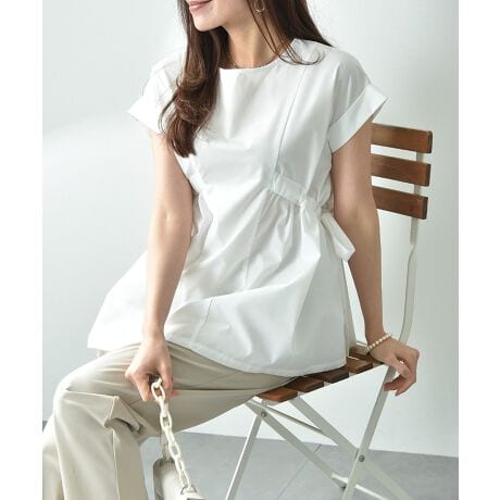 女性らしい優しいスタイルが出るよう、ギャザーのボリュームシルエットにこだわりました。サイドのリボンで絞りを調節できるのでお好みのシルエットアレンジが可能です。程よくハリ感のあるコットン混の素材を使用し、透け感もほとんどなく、シワが目立ちにくいのも◎