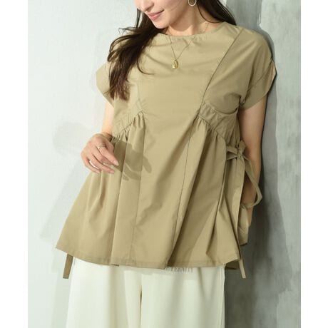 女性らしい優しいスタイルが出るよう、ギャザーのボリュームシルエットにこだわりました。サイドのリボンで絞りを調節できるのでお好みのシルエットアレンジが可能です。程よくハリ感のあるコットン混の素材を使用し、透け感もほとんどなく、シワが目立ちにくいのも◎