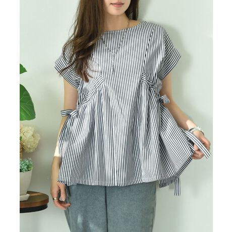 女性らしい優しいスタイルが出るよう、ギャザーのボリュームシルエットにこだわりました。サイドのリボンで絞りを調節できるのでお好みのシルエットアレンジが可能です。程よくハリ感のあるコットン混の素材を使用し、透け感もほとんどなく、シワが目立ちにくいのも◎