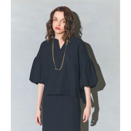 【Japan Fabric】表情のあるニットライクジャージ素材でお作りしたスキッパートップス。袖をチュールと二重仕立てにして、立体感のあるバルーンスリーブに仕立てた華やかでモード感のあるデザイン。首元はあえてスキッパーネックにして、ふっくらとした愛らしい袖とのコントラストを楽しめつつ、甘すぎないデザインに仕上げました。ニットならではの肩肘張らない着心地が、大人のニュアンス感溢れる装いを楽しめるポイント。お揃いのスカートを合わせたセットアップスタイルもおすすめです。