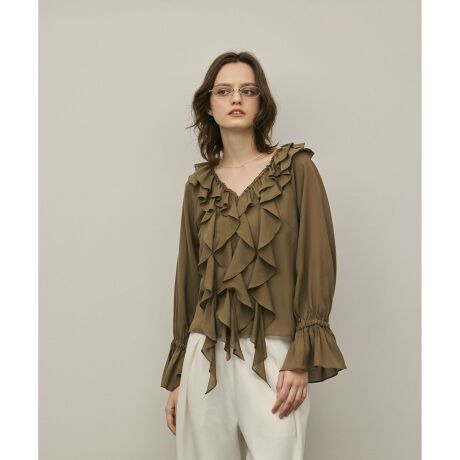 [型番:0326241309]薄手デシンのような柔らかい素材のフリルブラウス。生地を贅沢に使用したたっぷりのラッセルフリルがポイントとなっております。※こちらのモデル着用画像はサンプル品を撮影しております。実際の商品と仕様、加工、サイズが若干異なる場合がございます。予めご了承くださいませ。