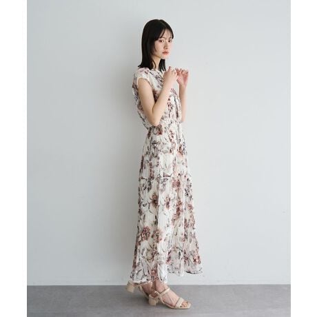 大人っぽい色調のフラワー柄とシアー素材のプリーツが印象的なロングワンピース。