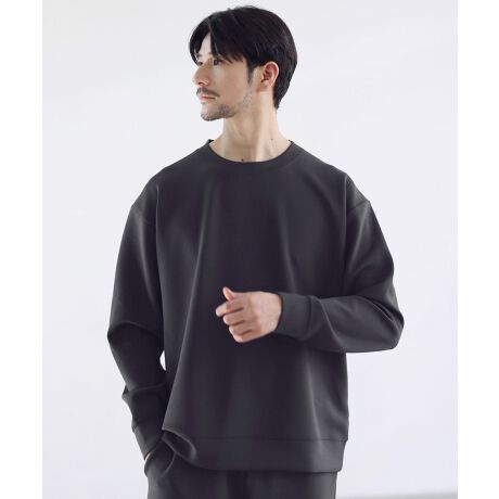ゆったりめの身幅で設計しつつも袖はゆとりを抑えて、部屋着感が強くなってしまわないように調整した絶妙なゆるめのシルエットになっております。上からアウターを重ねてもごわつきにくいサイズ感です。ネックはベーシックで使いやすいクルーネックを採用。洗練されたクリーンな印象のデザインで、大人のスウェットスタイルをお楽しみいただける一着です。