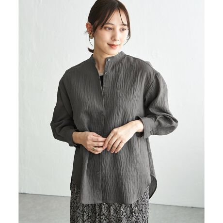 ほんのり透けるリネン素材が、涼しげな印象をつくるバンドカラーシャツ。