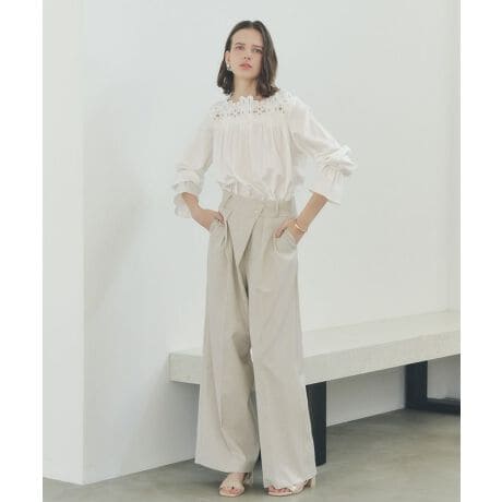 メタルホックをあしらったミニマルなウエストデザインのワイドパンツ。