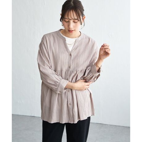 凹凸のある楊柳素材で、汗ばむ時期にもさらっと快適に着られるバンドカラーシャツ。