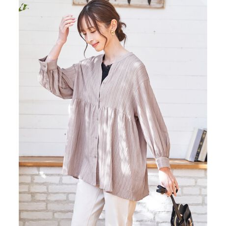 凹凸のある楊柳素材で、汗ばむ時期にもさらっと快適に着られるバンドカラーシャツ。