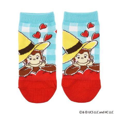 大人気おさるのジョージのスニーカー丈ソックスです。ギンガムチェックに帽子をかぶったジョージとちりばめられたハートがとってもキュートな一足です。