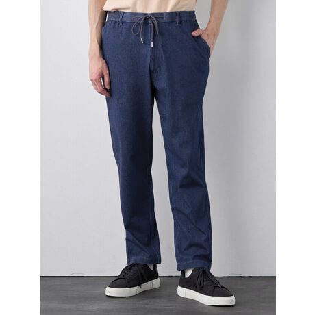 【 キレイ見えシルエットのイージーパンツ 】ニットファブリック(ジャージ生地)デニムのイージーパンツ。リアルデニム見えのする、ジャージらしい柔らかな履き心地。ゆとりある腰回りから裾に向けテーパードした綺麗なシルエットにこだわり型紙を設計。スラックスより8cm短い股下寸法も、裾のもたつきを軽減。アメリカ西海岸の穏やかな日常をイメージした織ネームつき。フロント開閉可能、ベルトループ付き、2WAYスピンドル仕様。洗い加工違いで濃淡差をつけたインディゴ系2色展開。