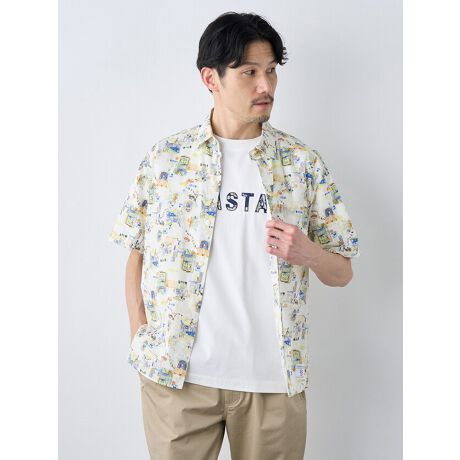 [型番:7251222]【 安らぎのイラストプリントシャツ 】海辺の町の様子を切り取ったイラストをプリントしたコットンローン生地の半袖シャツ。楽しげで和やかな気分になるこのシャツは、リラックスしてTシャツの上から羽織れる、ゆとりのあるサイズ設計に。裾にはリラックスライン限定ネームを配置。背ヨーク裏に"Relaxed Fit"の刺繍を追加。