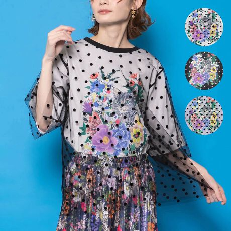 マルイウェブチャネル   /   トップス   /   Tシャツ・カットソー   /   ScoLar スカラー ドットチュール重ね花ネコ柄Tシャツ