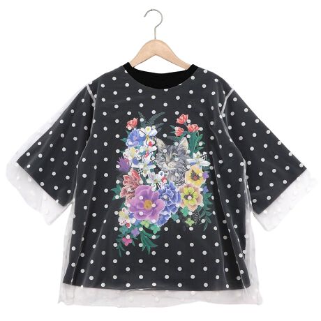 ・ドット柄フロッキーチュールからのぞく、花とネコ柄デザイン