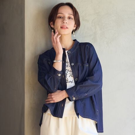 すっきりとしたバンドカラーで首周りをカバー。デニムの表情をしなやかで柔らかに楽しめるのでこれからの季節におすすめ。