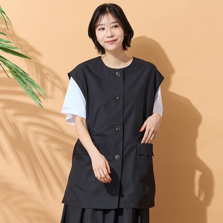 タイプライター素材で作ったジレは、ノーカラーですっきり見え。