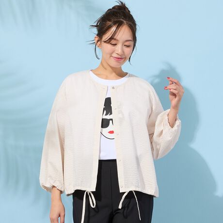 後ろ襟ぐりにギャザーを寄せ、袖口にゴム、ヘムに共布のドローコード入りで、ふんわりとした丸みのあるシルエットが大人可愛いデザインです。