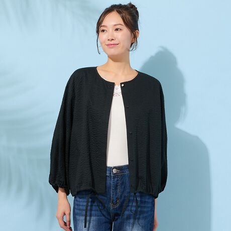 後ろ襟ぐりにギャザーを寄せ、袖口にゴム、ヘムに共布のドローコード入りで、ふんわりとした丸みのあるシルエットが大人可愛いデザインです。