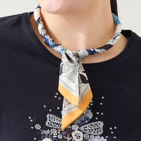 紺ベースの柄にオレンジの配色が効いた、こなれ感のあるスカーフ柄。