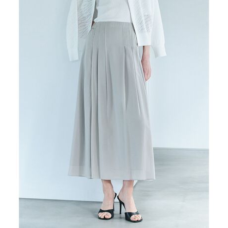 ■デザインフロントのタックがポイントのロングスカートです。分量があるデザインながら、落ち感のある素材のため広がりすぎず、大人な印象で履いていただけます。またウエストベルト部分にはゴムギャザーを入れ、履き心地の良いデザインに仕上げました。シンプルなトップスと合わせても映えるシルエットで、スタイリングのアクセントになる一枚です。同シリーズのジャケットとのセットアップ着用もおすすめです。