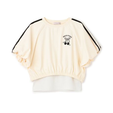バルーンスリーブが目を引くショート丈のトップスとタンクトップのセットです。スポーティーになりがちなサイドラインのデザインを、お袖のシルエットでガーリーに仕上げました。左胸にはリボン&チェリー刺しゅうでアクセントをプラス。インナーのタンクトップはラメ入りで、さりげないキラキラがかわいいポイントです。お腹が見えるのをカバーしつつ、ワンランク上のコーデを楽しめます。