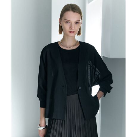 ■デザインスッキリとしたV開きのノーカラージャケットです。ドルマンスリーブの程良い分量感がポイントで、適度に女性らしい印象を加え今シーズンらしいバランスに仕上げました。袖口のカフス部分がブラウスライクなデザインなのもポイントです。羽織りとしてももちろん、釦を留めてトップスのようにも着用でき、幅広く活躍する一枚です。同シリーズのパンツ、スカートとのセットアップ着用もおすすめです。