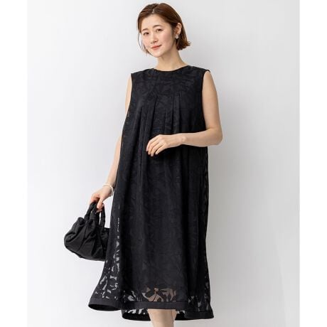 APPLAUDIRオリジナル柄をオパール素材で立体的に表現したノースリーブドレス。シンプルな形をベースに、フロントにきかせたタックと程よい分量感にこだわりました。裾にサテン素材を部分使いすることでアクセントにしています。カラーは、奥行きを感じさせるシックなブラック(#005)と清楚な気品を感じさせるネイビー(#075)の2色展開です。