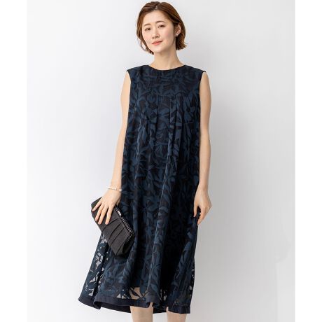 APPLAUDIRオリジナル柄をオパール素材で立体的に表現したノースリーブドレス。シンプルな形をベースに、フロントにきかせたタックと程よい分量感にこだわりました。裾にサテン素材を部分使いすることでアクセントにしています。カラーは、奥行きを感じさせるシックなブラック(#005)と清楚な気品を感じさせるネイビー(#075)の2色展開です。