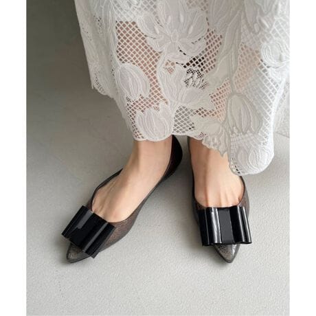 光沢感のあるビニール素材でできたリボンが足元で主役級の存在感を放つ、これまでにないデザインのレインシューズ。