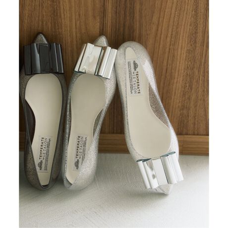 光沢感のあるビニール素材でできたリボンが足元で主役級の存在感を放つ、これまでにないデザインのレインシューズ。