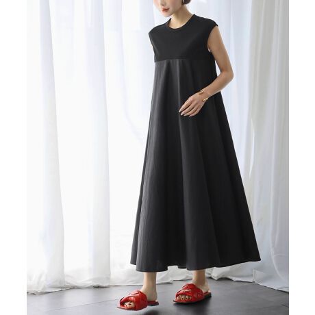 異素材ドッキングノースリーブフレアロングワンピース