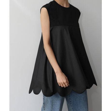 カットソーと綿混のハリ感ある布帛をドッキングし、華やかさを出す為に裾にスカラップ刺繍を施したチュニックです。
