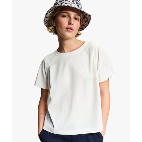 肩のダブルプリーツとドロップショルダーが抜け感のあるシルエットを描き、さまざまなボトムスとナチュラルに調和する一枚。