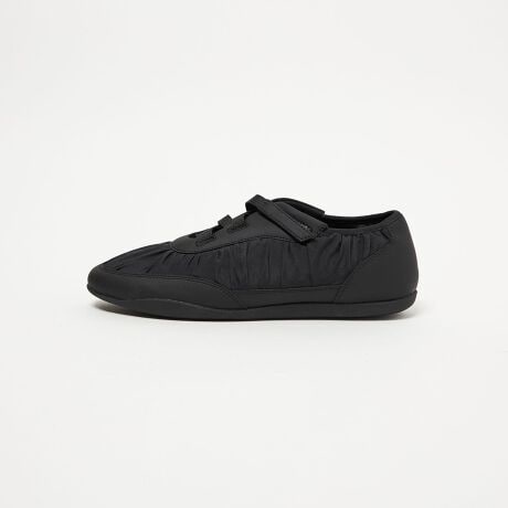 ギャザーの寄ったアッパーとすっきりとした薄型のフォルムがトレンド感ある一足です。