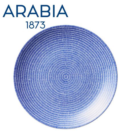 "24hAvec"は、2003年にアラビア創業130周年を記念して発売されました。ブルーは2013年に作られたオリジナルカラーのうちの1色です。放射状に描かれたパターンは、24Hシリーズのシェイプの柔らかいカーブにフィットするようにデザインされています。「生き生きとした色でプレート全体に絵柄をのせたかった。そのために、模様の配置の規則性を慎重に考えたんです。」と、デザイナーのカティ・トゥオミネン=ニーットゥラはコメントしています。シェイプはヘイッキ・オルボラによる24hシリーズのもので、朝から晩まで24時間つかえることをコンセプトとした機能的なデザインで、和洋中からエスニックまで様々なお料理にマッチし、幅広くお使いいただけます。表面に小さな黒点や釉薬上のへこみ(ピンホール)が生じることがありますが、品質上問題はございません。電子レンジ・オーブン使用可。急激な温度変化は破損の原因となりますので、急に熱湯を注ぐ、食器が熱いうちに冷たいものを入れるなどしないでください。