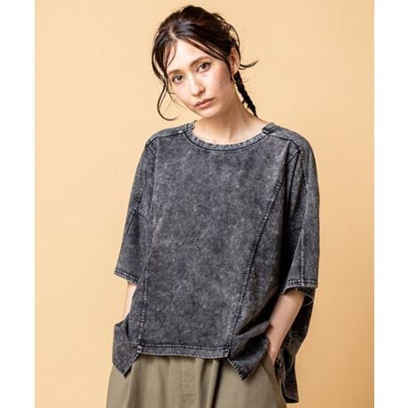 素材について: ケミカルウォッシュ加工の施されたややハリのあるTシャツ地/ケミカルプリントのシワになりにくいブラウス地